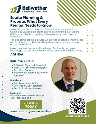 Join BCCU and Frasca & Frasca for a valuable, NH Accredited Continuing Education 2-credit course designed to help realtors better serve clients navigating estate planning and property transitions.